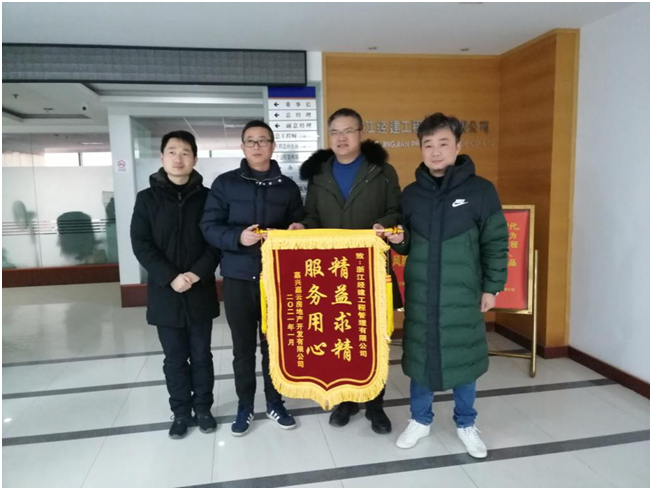 2021年1月8日,嘉興嘉云房地產(chǎn)開發(fā)有限公司工程部經(jīng)理范永凌將一面寫有“服務(wù)用心,精益求精”的錦旗送到我公司,對我公司在中糧祥云項(xiàng)目監(jiān)理中的專業(yè)表現(xiàn)、敬業(yè)態(tài)度、嚴(yán)謹(jǐn)作風(fēng)表示肯定,對我公司的技術(shù)能力、實(shí)施能力和管理能力表示高度贊許。